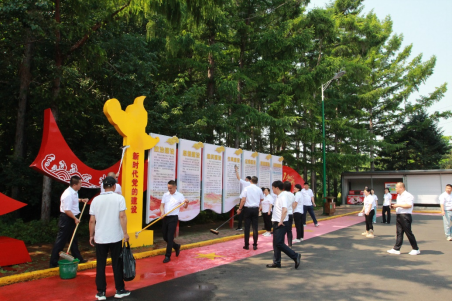 最后,全体党员干部开展“清洗党建广场”志愿服务活动。二十多名党员携带水桶、拖布、抹布、水车等清洁工具,明确分工和任务要求,撸起衣袖,认真负责,迅速开展工作,对党建基地主广场进行打扫和清洗。在大家紧密配合共同努力下,广场雕塑和宣誓墙焕然一新,不仅用实际行动诠释了“奉献、友爱、互助、进步”的志愿服务精神,也在中国共产党成立103周年、中华人民共和国成立75周年纪念日向全社会展示出植物园党建基地的精神风貌。